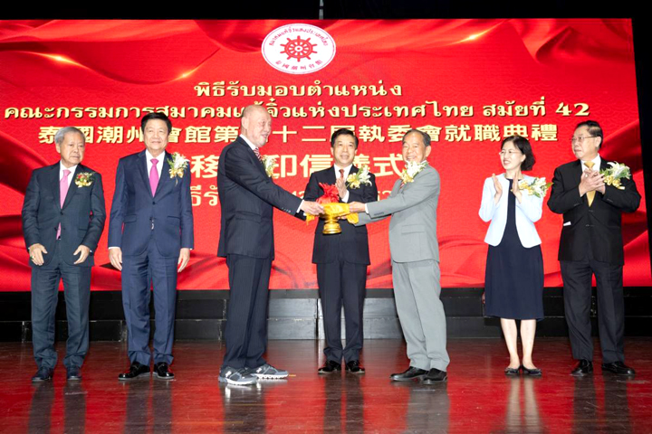 大會主席陳漢士主持潮館第四十二屆執委會就職典禮 中國駐泰特命全權大使韓志強題詞繼往開來再築輝煌嘉賓潘瑾林楚欽黃漢良馬燦利黃建華吳炳林等六百餘人見證徐惠深蟬聯主席再展新猷