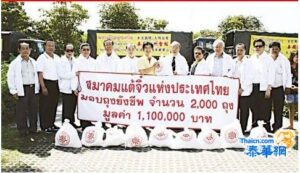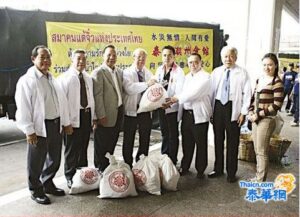 泰国正遭受半个世纪以来特大洪灾袭击,中部、北部和东北总共有30府被大水淹浸,受灾人数达230多万,造成310多人罹难,经济损失逾千亿铢,灾区民众的人身财产安全受到严重伤害。水灾无情,人间有爱。泰国潮州会馆主席陈汉士博士亲自于2011年9月30日主持召集举行第36届第七次执委会议,全体执委在蔡汉强副主席的提议下,一致通过一项重要的决议,就是立即成立抗洪救灾小组,推举一贯热心侨社事务的蔡汉强副主席为救灾小组主任,各位副主席为副主任,全体常执委为委员,迅速行动起来,投入抗洪救灾爱国运动之中。常执委们热情高涨,纷纷捐款济助灾区同胞,即席集得善款850万铢,并以最快的速度,置办到第一期赈灾物资共1万份,总值5百多万铢,计有食用油、水、快食面、罐头鱼、药品、水电筒及铝锅等。