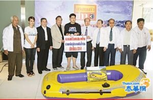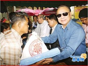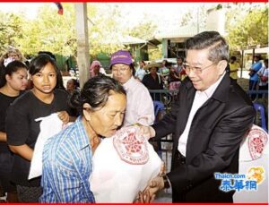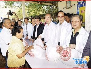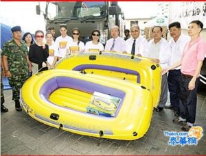 泰国遭遇数十年来最为严重的水灾,全国不少府治及湄南河流域沿岸之府治俱成汪洋泽国,工业区良田,居民被淹浸,人民生命财产遗失严重,在洪水灾害面前,泰国潮州会馆在主席陈汉士博士领导下,早于九月杪成立潮馆抗洪救灾小组,并委蔡汉强副主席为救灾小组主任,在陈汉士主席指导下,潮馆全体执委有钱出钱,有力出力,本着守望相助之精神,展开行之有效工作,抗洪救灾小组在蔡汉强主任领导下,第一期赈灾物资一万份分送政府各有关救灾机构转达灾区赈济灾民,让处在水深火热灾民暂解燃眉之急。