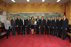 11月7日(星期三),微风徐徐,桂花飘香。在中国驻泰大使馆方文国参赞、泰国福建商会韩异总干事的陪同下,中国国侨办经科司副司长于建明率领“中国创业政策咨询报告团”拜访泰国潮州会馆。随团的成员还有:国家发改委宏观经济研究院主任吴晓华;科技部国际合作司参赞莫鸿钧;人力资源和社会保障部留学人员和专家服务中心副主任李璟;国侨办经科司处长王军。上午十一时许,(泰国潮州会馆主席蔡汉强因会务出国,)由会馆副主席梁润潮协同副主席苏岳章、陈绍扬、张荣炳;常务财政张汉辉;常务稽核薛建荣、陈兆渭、梁金强和总干事王增辉等在会客厅一同接待于建明副司长一行。大家亲切交谈,互赠纪念品,然后到大厦前一同合影留念。接近中午时,会馆特地为他们在二楼音乐室准备了丰盛午宴。在宴会上,梁润潮副主席、于建明副司长分别做了精彩洋溢的致辞。梁润潮副主席在致辞中代表泰国潮州会馆热烈欢迎“中国创业政策咨询报告团”的来访,赞扬贵团在中国国务院侨办的组织下,贡献良多,期盼通过此次访问增进双方了解。于建明副司长在致辞中表示,感谢泰国潮州会馆的盛情招待,自己第一次到泰国,感受良多。中国经济快速发展离不开海外华人华侨的贡献,希望在座有机会多到中国走走看看。泰国是该团访问的第一站,第二站是马来西亚,随后到新加坡。另外还给大家介绍了贵团成员与访问的目的。在宴会上,大家畅所欲言,频频举杯互祝,至下午一时许,方告辞别。