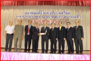 - 泰国潮州会馆蔡汉强主席颁发请任书,罗勇府分会张步青主席接领。