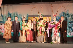 图二:侨领锺源泉锺杨培珍伉俪,郭木海郭赖婵卿伉俪,张荣炳与国家一级演员,方展荣先生演王阿义,国家一级演员张怡凰小姐演仙女合影。