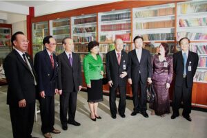 4、永远名誉主席李光隆,蔡汉强主席,副主席梁润潮、马君楚、刘振禀、梦莉等陪同宁赋魁大使伉俪参观图书馆时影。