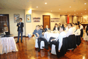 吳南祥顧問、陳淑明主席先後致詞,代表該團全體成員,感謝潮館諸位首長及常執委的熱情接待;接著敘述該會此次舉全會之力,籌備舉辦本屆國際潮青聯誼年會之信心和決心;推崇泰國潮州會館在國際潮團聯誼組織中的作用和影響,令人欽敬佩服。誠邀潮館今年9月份組團光臨新加坡指導,共聚獅城創新潮!陳輝明主席向黃迨光副主席遞交邀請函;鄭勇棉秘書長在座談會上補充報告年會籌備工作情況,并回答在座諸位首長的詢問,氣氛融洽,場面愉快。