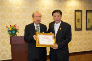 (七) 蔡汉强主席颁赠珍贵特辑予名誉主席陈运楼,与潮馆副主席合影。