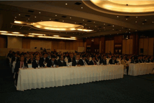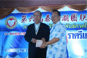 词毕,蔡汉强主席代表泰国潮州会馆捐助本届年会经费十万铢,由萧志鸿主席接领;双方并互赠纪念品;移交年会会旗予第七届主办单位攀牙府潮州会馆代表接领。欢送晚宴上并有乡亲代表和师生表演精彩歌舞,唱歌助兴,至晚九时多愉快结束,相约下届年会再见。