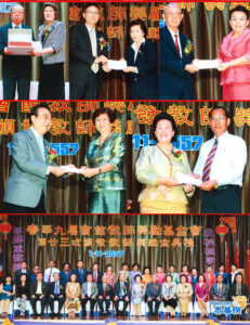 吴志武公参词毕,即举行颁发奖盾予赞助人。计:中国大使馆十万铢,泰国潮州会馆蔡汉强主席廿万铢,陈万平副主席十万铢,泰国客家总会,廖默林永远名誉理事长十万铢,张盛财永远名誉理事长十万铢,巫碧珠理事长十万铢,泰国华文民校协会梁冰主席十万铢,泰国广肇会馆何国雄理事长十万铢,泰国海南会馆林明焕副理事长十万铢,泰国福建会馆十万铢,泰国云南会馆、侯永安廿万铢,刘谢坤十万铢,闪耀兴十万铢,泰国广西总会李铭如主席十一万五千铢,会上并由泰国潮州会馆主席蔡汉强主持颁发特别纪念盾予梁冰女士,表彰她在泰华九属会馆教师奖励基金会执行主席任内作出的特殊贡献。