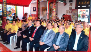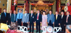 当交流会到一段落,刘振禀主任代表庙委会呈送纯金99%「本头公圣像牌」予各庙宇代表保平安,落得皆大欢喜,咸认不但大开眼界,还大丰收,实不虚此行,接着,刘振禀主任接受各庙宇代表坤蒙空呈献表扬奖盾,宾主合影,留下了:「本头显赫古木森森万商云集全民沾福泽,公庙庄严湄河淼淼四海凉通百业自昌 隆」深具意义又弥足珍贵镜头……。