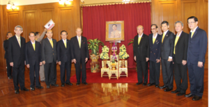 图:1.潮馆主席蔡汉强,副主席梁润潮,张朝江,陈绍扬,朱春隆,刘振禀,廖汉明暨首长张仲威,张汉辉,徐光辉,郑岳龙,薛建荣晋宫签名祝寿。2.潮馆副主席陈绍扬,朱春隆,刘振禀,廖汉明及首长萧鸿洽,徐光辉,郑岳龙,薛建荣签名祝寿。3.蔡汉强主席偕副主席梁润潮,张朝江,陈绍扬,廖汉明暨首长张仲威,张汉辉,萧鸿洽,徐光辉,郑岳龙在泰皇上陛下御像前合影。4.蔡汉强主席与名誉主席刘锦庭,副主席梁润潮,朱春隆,刘振禀,廖汉明及首长张汉辉,薛建荣,章德辉,刘树光等晋宫签名祝寿时合影。5.蔡汉强主席与副主席梁润潮,张朝江,陈绍扬,朱春隆,刘振禀,廖汉明及首长张仲威,张汉辉,萧鸿洽,徐光辉,郑岳龙,薛建荣,马灿伟等合影。6.潮馆副主席陈绍扬,陈振治,刘振禀,陈万平及首长张仲威,萧鸿洽,徐光辉,郑惠中,王济达,张源晋合影。
