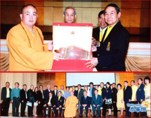 泰中工商业联合总会主席侧塔‧他那乍隆上将,于十二月十六日晚六时,在曼谷特位斜亚育他耶路陆军俱乐部礼堂,设宴热烈欢迎中国河南省嵩山少林寺方丈释永信率团访问,中国驻泰大使馆文化参赞陈疆,泰国潮州会馆主席蔡汉强等约三百人出席,场面热烈,亲切和谐,接福纳祥。