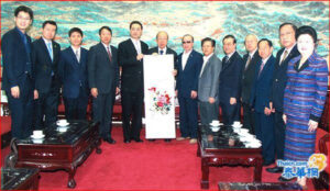 蔡汉强主席致热情洋溢欢迎词,他指出很高兴迎来老朋友朱副司长一行参观访问、指导,蔡主席说潮馆是泰华九属龙头会馆,辖下还有各县同乡会,是泰华重要侨团,泰华侨团与祖籍国关系密切,一向以爱国爱乡为宗旨,在泰国则协助侨团融入主流社会,今年是中泰建交40周年具历史意义年份,潮馆将联合九属会馆,各县 同乡会联合举办中泰建交四十周年庆祝盛会,请朱副司长,方文国参赞大力支持指导,达此新年将至祝新一年中泰友谊更上一层楼,祝朱副司长一行在泰国行程圆满成功。朱柳副司长在致词指出,长期以来国侨办与潮馆往来密切,大家都是老朋友,首先我代表裘援平主任,代表国侨办向蔡汉强主席及潮馆诸首长并转达全泰侨胞,祝福新年快乐幸福。他高度评价潮馆是最具影响力侨社,长期以来为泰华侨社侨胞服务,推动泰国经济发展,辖下华校在传承中华文化发挥积极作用,对祖籍国始终抱着赤子之心,当中国发生自然灾害如去年云南地震,第一时间伸出援手,对中国发展,对中国和平统一都做出应有贡献,今年是中泰建交40周年,两国有悠久友好往来历史,文化相通地理相邻,泰中两族水乳交融,「中泰一家亲」深入两国人民心中,诗琳通公主殿下精通中国文化对中国人民有深厚感情,各领域如高铁、农业合作不断深化,而 潮籍乡亲经商有道,一大批经济界巨子,相信中泰携手拓宽东盟一体化广阔。国侨办是海外侨胞之家,未来我们准备在侨社建设,文化交流,中医关怀等为侨胞做点实事,感谢大家热情接待,祝潮馆在蔡汉强主席领导下乘风破浪,永续辉煌。永文国参赞在致词时表示潮馆做为龙头侨社有七十六年历史为中泰两国公益慈善事业做出大量贡献,多年来与大使馆合作完美,完成联合各界多项接待国家领导莅访工作等。最后,宾主互赠纪念品并合影留念。