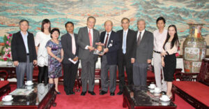 图上:蔡汉强主席与黄根和社长亲切交谈。图下:宾主互赠纪念品合影留念。