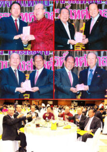 图:(一)左:秦国潮州会馆主席蔡汉强致词。右:中国驻泰大使宁赋魁致词。(二)蔡汉强主席颁发幸运奖品予夫人蔡马楚娟。(三)荣誉主席郑创基颁发幸运奖品予永远名誉主席李光隆。(四)蔡汉强主席,宁赋魁大使与首长李光隆,郑创基,刘锦庭,张朝江,陈振治席间举杯共贺新春大吉。(五)蔡汉强主席伉俪,宁赋魁大使伉俪与首长夫人王林怡珠,陈林静心,陈林惠珊及令千金,陈郑丽明席间举杯互祝新年。(六)朱伟东参赞兼总领事与潮馆副主席陈卓然,方炜,陈绍扬,陈振治,黄汉良,黄迨光,廖汉明敬酒合影。(七)方文国侨务参赞与潮馆副主席朱春隆,陈金苞,张荣炳,梦莉及马灿伟席间合影。(八)蔡汉强主席与荣誉主席王金国伉俪,名誉主席姚宗侠,副主席陈绍扬,王睦良,张荣炳伉俪,陈万平及薛建荣,锺灿峰,吴金城合影。(九)培英学校学生表演歌舞喜迎新春大吉。 |