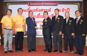 泰國潮州會館副主席黃迨光博士致詞,首先代表因公出國訪問的蔡漢強主席及全體常執委,向陳秋井主席及全體理事會員致以熱烈的祝賀和親切的問候;接著充分肯定該會三年來會務活動所取得的成果和榮耀;最後熱情鼓勵該會全體理事繼續努力,爭取更大的成效業績;順祝在座長官、僑領、嘉賓新年吉祥快樂,生意興隆,家庭幸福,萬事如意!詞畢,代表潮館移交贊助慶典大會經費五萬銖予陳秋井主席接領;賓主互贈紀念品并合影留念。慶典大會始終洋溢著歡慶喜樂氣氛,至晚九時多盡歡結束。