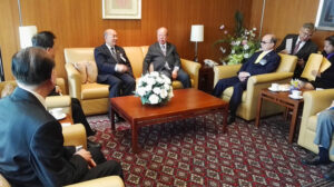 圖:(一)泰國樞密院大臣甲盛醫師與泰國潮州會館主席蔡漢強親切談話。(二)蔡漢強主席敬呈一百萬銖善款予樞密院大臣甲盛醫師接領,與首長王睦良,陳萬平,許家偉,張漢輝及林盛,陳隆叻等合影。(三)許家偉常務秘書敬獻禮品籃予樞密院大臣甲盛醫師,與蔡漢強主席及諸位首長合影。(四)賓主親切座談場面。