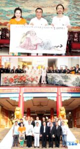 图一:中国潮起五洲书画院副团长黄露漫致送佳作予黄迨光主席。图二:潮起五洲书画院元宵泰国庆贺团与潮馆各同乡会首长互祝—新春如意、元宵快乐。图三:宾主于泰国潮州会馆大厦前合影。 |