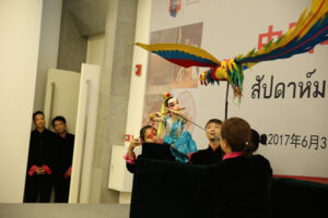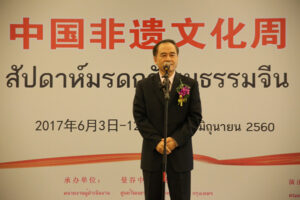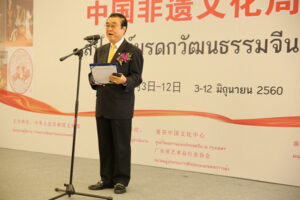 2017年6月3日【中国非遗文化周】开幕活动在曼谷中国文化中心举办。该活动由中华人民共和国文化部主办,曼谷中国文化中心,中外文化交流中心和广东省艺术品行业协会共同承办。中国驻泰国大使馆文化参赞陈疆、曼谷中国文化中心主任蓝素红、泰中文化促进委会副主席班迪•诗力丹荣、广东省艺术品行业协会秘书长李宁一、泰国潮州会馆主席黄迨光、泰国留学中国大学校友总会永远荣誉主席廖锡麟,文化中心高级顾问秦裕森、泰中工商业联合总会执行主席林伟,北京商会蔡荣壮会长,辽宁商会康丹会长,泰中艺术家联合会蔡义批会长,侨领蔡婵华,蔡丽,周月明,艺术家方楚雄,徐经纬,尹大伟等联合为活动剪彩揭幕。三百余名观众欣赏。