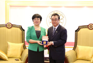 会谈毕,宾主互赠纪念品并合影后,同品尝泰国出名的小吃(芒果糯米饭)…