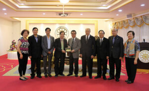 周光明主席讲话时表示,本团将赴印尼雅加达参加第19届国际潮团联谊年会,乘此机会顺途来泰观光考察,泰国潮州会馆历史悠久,名扬海外,所以怀着钦佩的心情,专诚前来拜访并参观学习。盛赞潮馆阵容坚强,规模及影响巨大,乃堪为海外侨团学习的榜样。