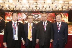 图八:泰国潮州会馆代表团团长黄迨光主席,李桂雄常务秘书与本届年会执行主席李汉泽,中国驻印尼大使馆孙伟德代办合影。