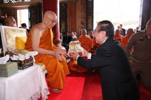 图三:护法主席黄迨光博士向泰僧皇献花。