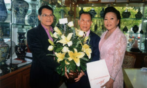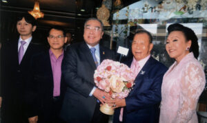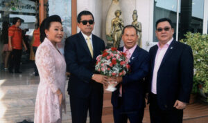 图四:泰中友好协会会长功•塔拍兰诗阁下向王金国王吴金凤伉俪献花致贺,与王蒙猜合影。