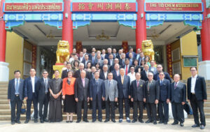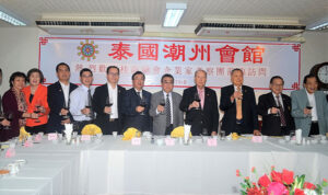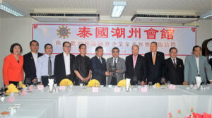 图二:泰国潮州会馆主席黄迨光博士代表泰华九属会馆与雷翔团长互相赠送纪念品,与潮馆副主席:张朝江,庄镇雄,陈绍扬,吴仲昭及访问团成员合影。