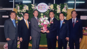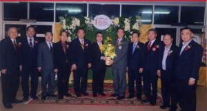 图五:泰国潮州会馆主席黄迨光博士向大会执行副主席蔡绪群献花祝贺,与刘振禀,李鉴川,蔡泰松,蔡华民,蔡广盛,蔡衍孝,蔡蔚生,陈坤潮,吴金城社长合影。