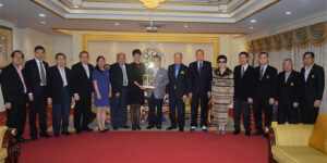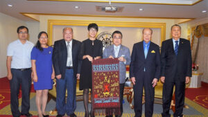 图三:泰国潮州会馆主席黄迨光博士代表泰华九属会馆与陈洁副主任互相赠送纪念品,与潮馆副主席:张朝江、庄镇雄及访问团成员合影。