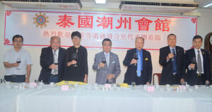 泰国潮州会馆是华人最大的地域性社团组织,泰国有六千七百万人口,华人华侨有一千二百万人口,其中潮汕人占了百分之六十至六十五,比汕头的人口还多,旅泰的潮汕人比较团结,有团队精神,潮人在泰国的政治经济中有着相当重要的地位。潮州会馆现在辖下有四个学校,这些基业都是一百多年前我们的先贤们创下的,一开始是幼儿园,后来就开办了小学,十五年前才创办了潮州中学。潮馆辖下还有四个山庄,先贤坐船来到泰国,什么都没有,来了以后很勤劳刻苦地谋生,拼命做生意,拼命赚钱,不幸去世的人就收埋在山庄里,按照记载的资料,山庄里埋葬的八万多人,有百分之七十是二十岁到三十五岁的青壮年,老人只占了百分之十,可见先贤们当年来泰国谋生是相当的不容易。华人在泰谋生的历史,其中的故事很多,很值得我们去学习研究的东西,我们的先贤是相当的伟大。潮州会馆有一百多年历史,但从真正注册的时间算起,就是八十年,明年四月廿八日,我们就要举行八十周年庆典,为了表示我们对先贤创下坚实基业的感恩,我是第十六任主席,对于以前的十五任主席对潮州会馆的贡献,我都会在特刊里面列出来,给后人留下资料记载。今天的潮州会馆大厦就是先贤给接班人留下来的,我们要感恩。