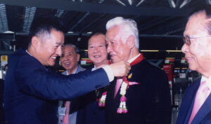 图四:泰国中华总商会主席陈振治为荣誉团长陈绍扬挂花送行。