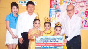 寿星翁寿庆不忘公益,捐赠泰国潮州会馆五百五十万铢,支持盛大庆祝成立八十周年。一如往年,给十四所学校捐赠教育基金和教学器材,小学生们跳古典舞蹈祝福。儿孙陪同切生日蛋糕吹寿烛,同唱生日快乐歌,满堂喜庆。