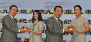 图四:左:黄迨光主席向陈胜伟老师颁赠纪念品。右:黄迨光主席向总策划李先列颁赠纪念品。