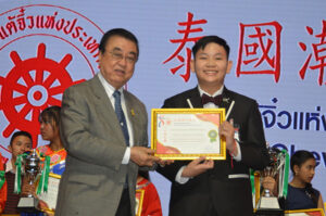 本人以泰國潮州會館名義,致力推動此次泰國冠軍錦標賽,希望各位參賽學生在良師的輔導下儘量發揮出歌唱才能,唱出水準,爭取好成績。最後,祝願大家身心康泰,萬事勝意,謝謝。