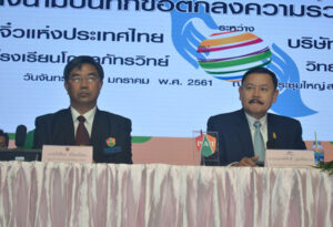 CP All(大眾)有限公司董事副总经理纳隆萨·奔诗沙安、正大科技学院院长威昌·廉儂分别在签约仪式上发表讲话。CP All(大眾)有限公司董事副总经理纳隆萨·奔诗沙安介绍正大科技学院的办学宗旨及将与潮州中学开展的教学合作具体情况,目前正大科技学院在全泰国已同近五十所高中学校开展了教学合作,此次与潮州中学的合作,目的是向高中学生提供有关职业技能的教学,让学生在中学阶段即能学习到职业技能,而且是行政方面的理论和实践经验,今后在职场上能学以致用,获得事业的成功。CP All(大眾)有限公司从佛历二五三八年开始就开办教育,现有7-11便利商店一万二千家,未来五年将增加到一万五千家,為什麼要开办教育,并不是為了找销售店员,我们开办教育的目的是创造新一代的业者和事业家,培养新一代的行政人员。CP All的业务涵盖面很广,书店,咖啡店,IT科技產品,市场销售等等,每一个业务领域都是适应时代,适应未来的业务,迎合国内和国外的发展需求的业务。在一万二千家商店中,属於公司的有百分之四十,其餘的百分之六十的便利商店是合营方式。正大科技学院现在与政府的职业学校开展合作的共有约五十所学校,与民营的职业学校合作的有一百多所学校,与十五所大学开展教学交流研究方面的合作。今天我们荣幸地能和潮州中学签约进行教学合作,我们将為潮州中学的高中学生传授职业技能。