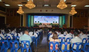 图九:潮州会馆主席黄迨光博士,CP All董事副总经理纳隆萨代表双方签字合交换合约,与张朝江、庄镇雄、陈绍扬、刘振稟、梦莉、许家伟、徐惠深、许镇南及正大科技学院领导,潮州中学学生合影。