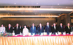 图四:大会开始,奏泰中国歌,主席台首长吕健大使阁下暨夫人潘鹏参赞,陈振治陈郑丽明伉俪,吴宏丰博士,刘锦庭,李春林,廖锡麟,张东浩,张朝江及全场出席者起立。