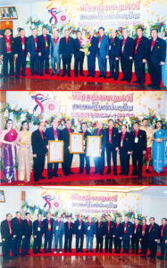 图五:泰国中华总商会主席陈振治向黄迨光主席献花致贺,与林楚钦,李桂