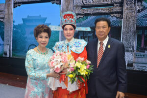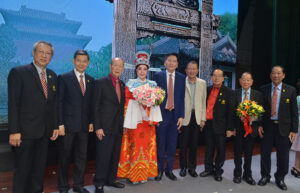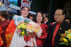 图六:张仲威奖赏潮剧团,由郭明城团长,郑舜英名誉团长接领。