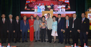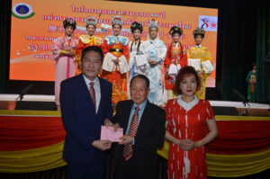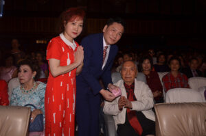 图五:资深侨领吴多福奖赏潮剧团,由郭明城团长,郑舜英名誉团长接领。
