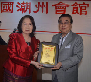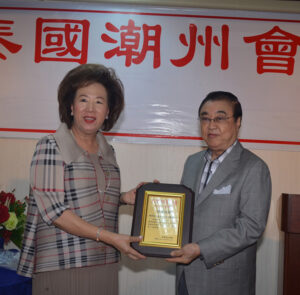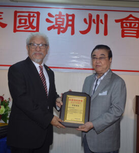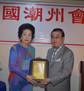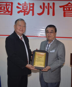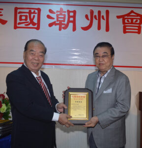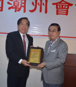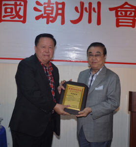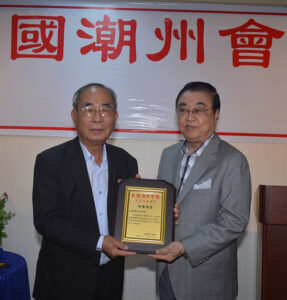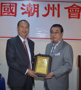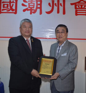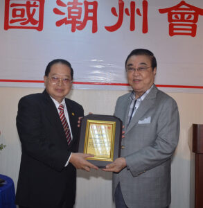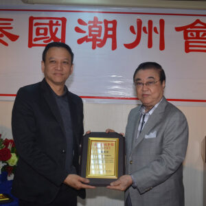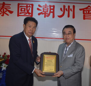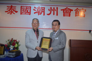 图一:泰国潮州会馆主席黄迨光博士向泰国中华总商会赠送荣誉奖盾,