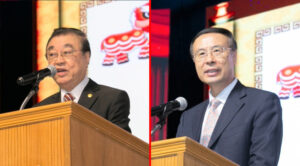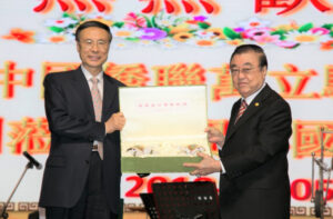 接著恭請中國僑聯主席萬立駿登臺致詞:尊敬的黃迨光主席,張東浩參贊,各位僑胞,各位朋友,女士們,先生們,大家晚上好!