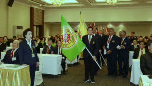 圖七:泰國潮州會館代表團由羅煒達常務秘書任旗手,各代表團旗手高舉會旗入場。