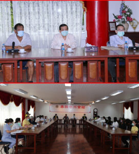 为做好分发生活包的工作,泰国潮州会馆主席黄迨光博士,副主席马龙辉、常务秘书萧俊杰、常务秘书李创福,沙通县长攀萨·乍能戍阁下及县署相关部门职官于6月4日下午一时卅分在泰国潮州会馆二楼会议厅举行工作会议,就维护赈济贫民当天的会场安排,社交距离,现场秩序等问题进行磋商。