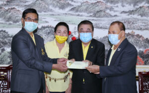 图二:荣誉主席王金国王吴金凤伉俪赞助赈济贫民活动经费五十万铢,由黄迨光主席接领,沙通区长攀萨见证。