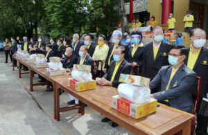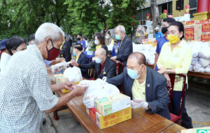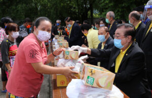 在潮馆大厦前举行的分发赈品活动,诸位首长在工作人员的配合下,将一千个生活包分发给持有领物券的一千个贫困家庭,区署职员协助维持秩序,包括保持社交距离,帮助老弱病残者领赈品,至上午十一时圆满完成,皆大欢喜。