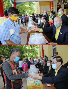 黄迨光主席,沙通区长攀萨阁下及诸位首长在工作人员的配合下,将一千个生活包分发给持有领物券的一千个贫困家庭,区署职员协助维持秩序,包括保持社交距离,帮助老弱病残者领赈品,至上午十一时圆满完成,皆大欢喜。