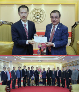 苏承智理事长敬向黄迨光博士送呈就职典礼邀请函,诚邀黄迨光主席出席泰国福建会馆将于10月31日(星期六)上午十一时在中总光华堂举行的第67届、68届理事会交卸就职典礼。黄迨光博士向苏承智理事长献花祝贺荣任泰国福建会馆第68届理事长,会谈结束后,黄迨光主席陪同苏承智理事长一行参观潮馆三楼的文物馆及图书馆并合影留念。