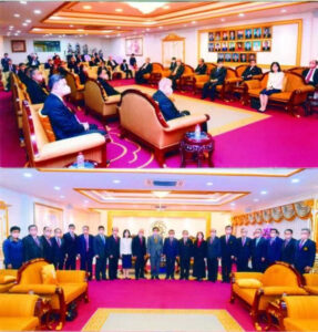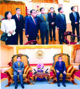 韩志强大使一行抵达潮馆时,受到主席黄迨光博士,副主席张朝江,陈绍扬,梦莉,廖汉明,蒋应初,许镇南,萧鸿洽,徐光辉,常务秘书李振钦,王森丰,萧俊杰,钟灿峰,李振来,罗炜达,彭大立,刘汉明,陈运金,常务财政马灿伟,常务稽核陈耀盛,常务组织廖翠珍,常务交际陈耀茂,泰华九属会馆,客家总会代理事长卢平光,海南会馆理事长符祥笈,福建会馆理事长苏承智,江浙会馆理事长张德仁,台湾会馆代主席黄月娇,云南会馆理事长侯永安,广西总会主席张振传,各县同乡会,潮安理事长陆少滨,潮阳代理事长李桂雄,揭阳理事长孙石波,普宁理事长李楚雄,澄海理事长刘秉青,大埔理事长黄家勇,丰顺主席徐位合,饶平理事长陈鸿辉,惠来代理事长方松坚,潮馆总干事孙平等热烈欢迎,在欢快氛围中,黄迨光主席等陪同下,韩志强大使一行参观了泰国潮州会馆,了解潮馆,九属各县同乡会联合事务发展状况。