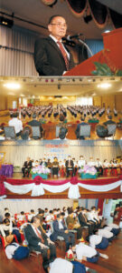 圖1:潮館徐惠深主席恭向泰皇御像行禮致敬。圖2:蕭俊傑副主席致訓詞,勉勵學生勤奮學業。圖3:拜師禮之場面。圖4:徐惠深主席,蕭俊傑副主席,邱燕桂副主席,廖令金常務財政,中、泰文校長在主席台上影。圖5:徐惠深主席等喜見學生知書明禮。